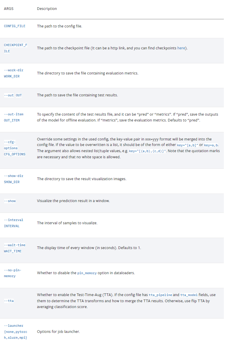 python tools/test.py ${CONFIG_FILE} ${CHECKPOINT_FILE} [ARGS]